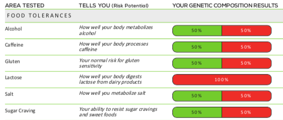 - High genetic variations in Food Tolerances – associated with a poor tolerance to alcohol, caffeine, gluten, lactose, salt and sugar cravings.