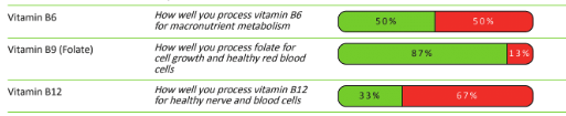 - High genetic variations in Vitamin B6 and B12 – which can lead to issues processing key vitamins needed for macronutrient metabolism, energy and keeping cells fed and healthy.