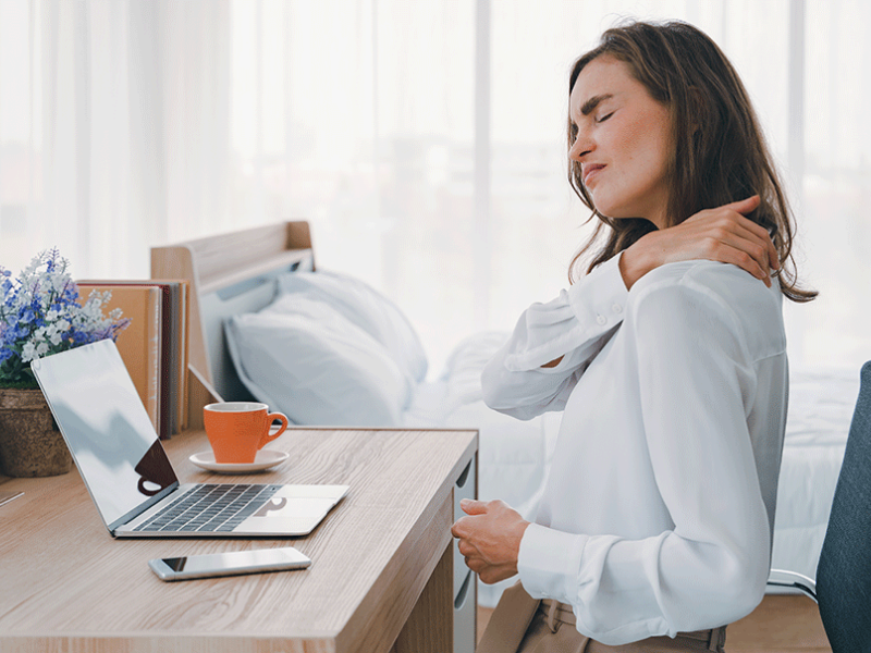 Remind your staff in the office and those working from home about the importance of working in an ergonomic space to prevent chronic pain and injuries.